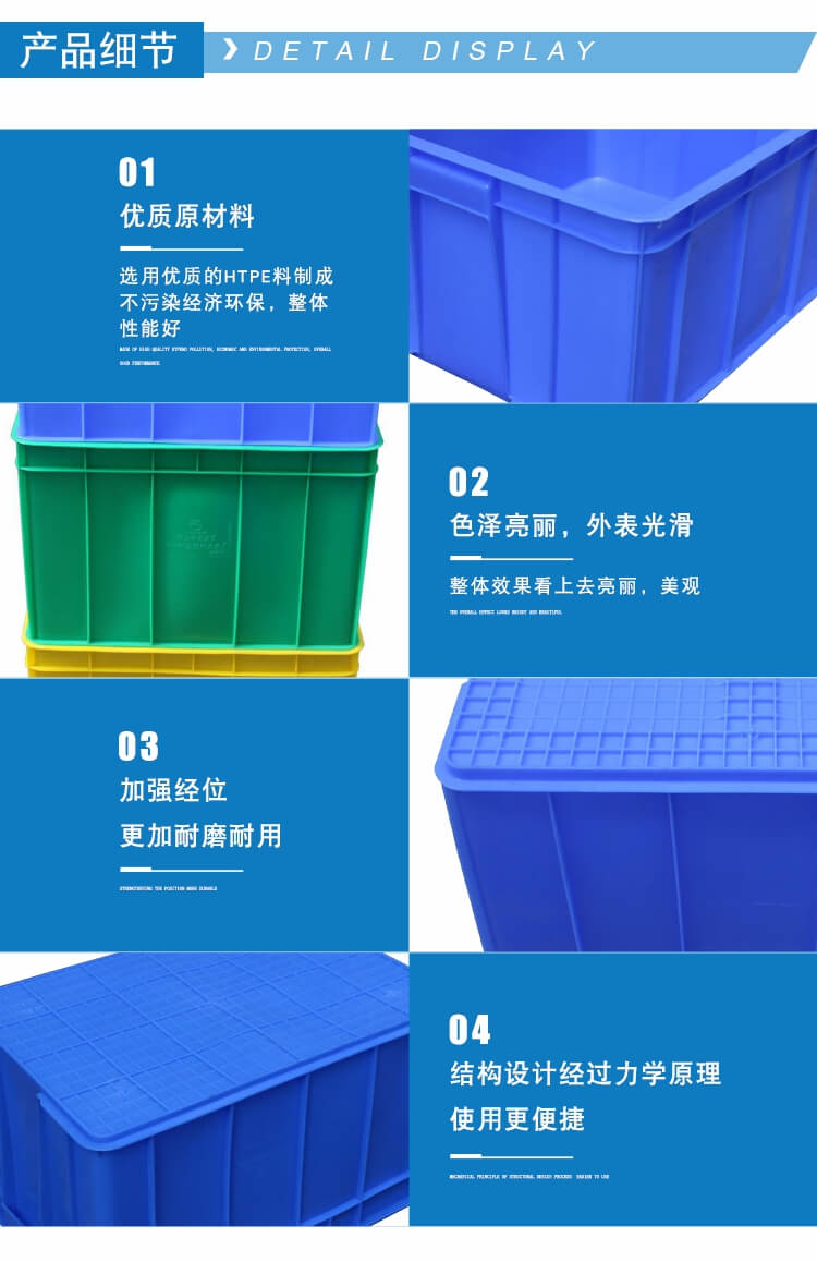 塑料周轉(zhuǎn)箱適用于服裝、五金、機(jī)械、電子、化工、儀表、養(yǎng)殖業(yè)、食品、水產(chǎn)、物流倉儲等行業(yè),可用于盛放食品,清潔方便,零件周轉(zhuǎn)便捷、堆放整齊,便于管理。其合理的設(shè)計(jì),優(yōu)良的品質(zhì),適用于工廠物流中的運(yùn)輸、配送、儲存、流通加工等環(huán)節(jié)。