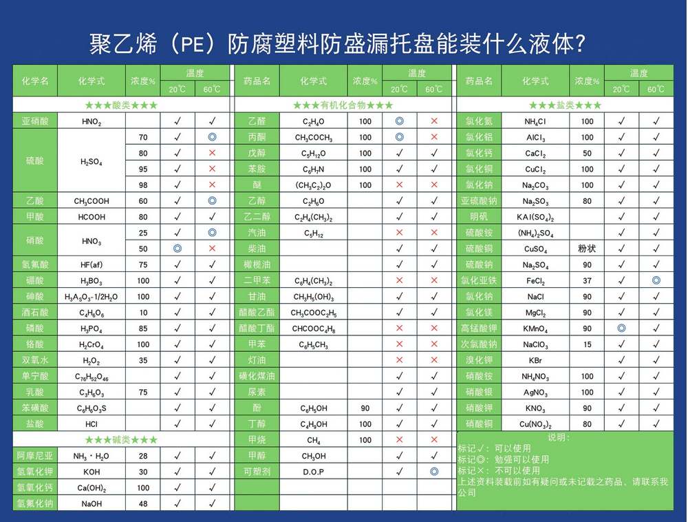 防泄漏托盤是使用純?cè)暇垡蚁〩DPE注塑而成,原料PE是一種結(jié)晶度高,非極性的熱塑性塑料,具有良好的耐高低溫,耐酸堿,耐腐蝕的特性,這種材質(zhì)常用與制造塑料包裝制品。